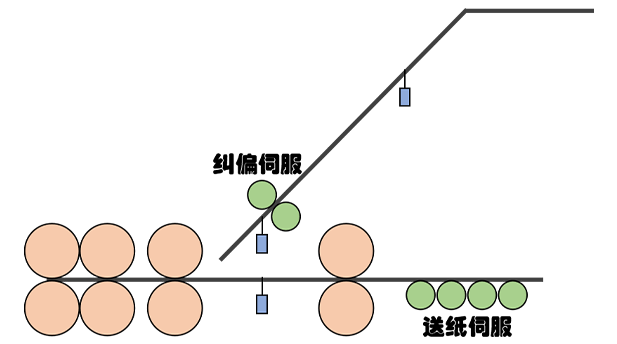高速裱紙機(jī)運(yùn)動(dòng)控制器部分方案,主要控制面紙糾偏和送底紙功能,根據(jù)5個(gè)高響應(yīng)光電進(jìn)行位置信號采集,通過位置疊加和凸輪功能執(zhí)行需求動(dòng)作。