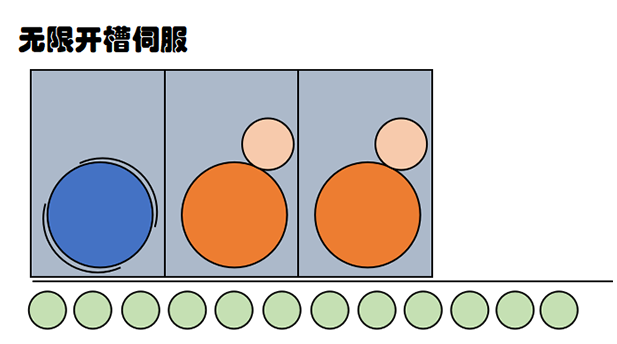 無限開槽應(yīng)用在瓦楞紙水墨印刷機的后段,開槽部分。主要實現(xiàn)的是成產(chǎn)紙板長度大于開槽周長的超長箱型,運動控制采取凸輪動作來實現(xiàn)該效果。